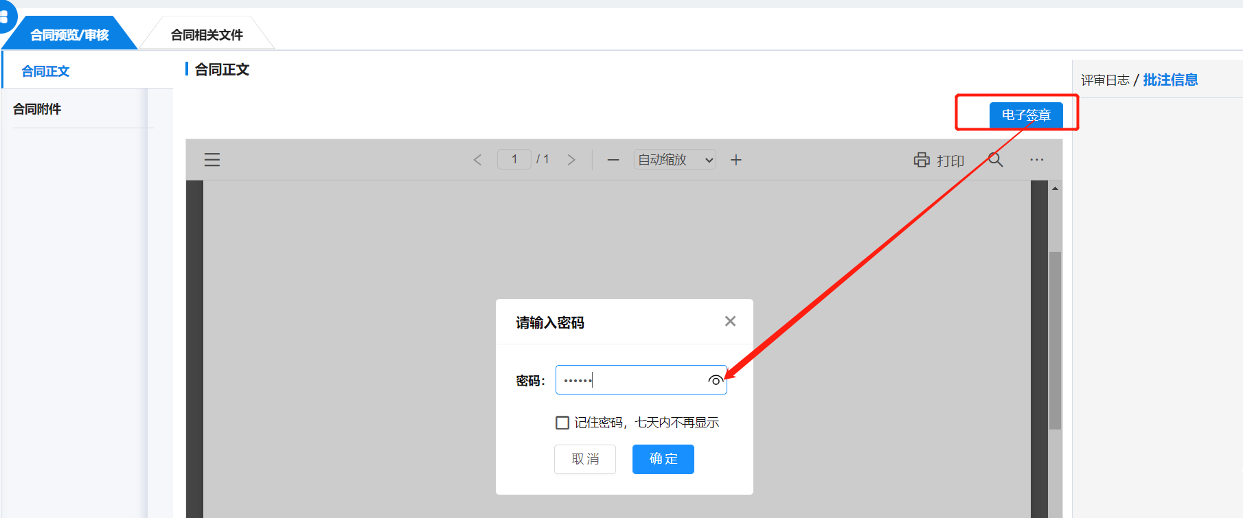 **步骤二:**页面右上角点击预览并盖章按钮点击电子签章输入密码选择盖章页数类型盖章成功。