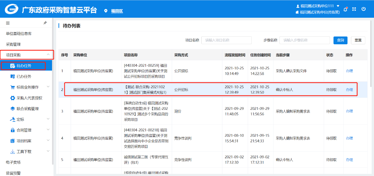**步骤一:**请依次选择“项目365bet登录_365bet.com亚洲版_北海365信息分类→待办任务”,找到待“确认中标人”的项目,点击【办理】,一个项目多个包时需要多次确认中标人。