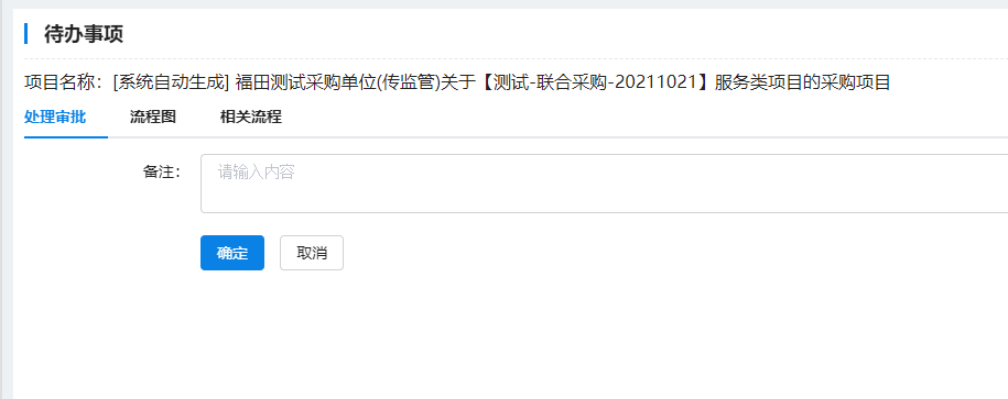 如果没有问题可以直接点击【审批】按钮,填写处理审批备注内容(可不填),然后点击【确定】提交至下一环节(供应商确认)。
