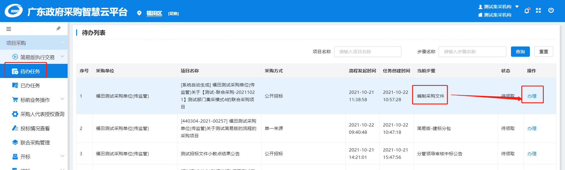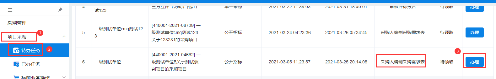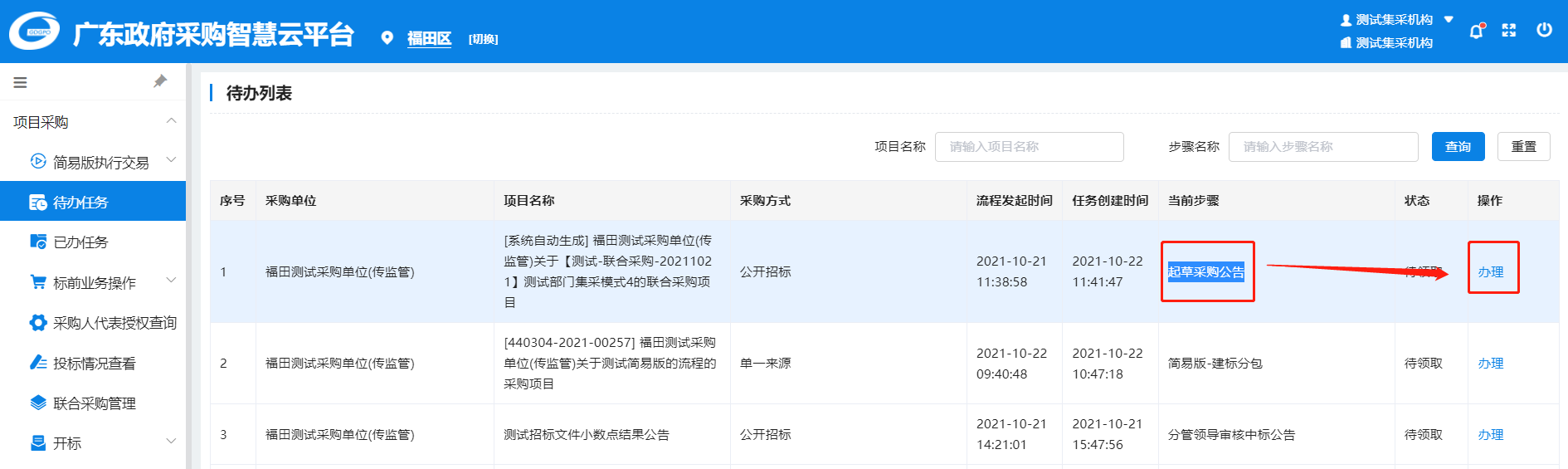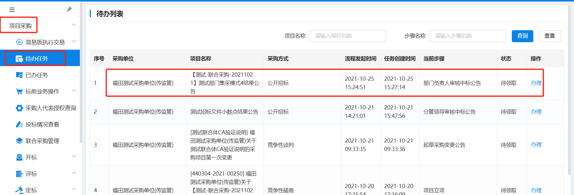 步骤一:请依次选择“项目365bet登录_365bet.com亚洲版_北海365信息分类→待办任务”,找到待“发布中标公告”的项目,点击【办理】。