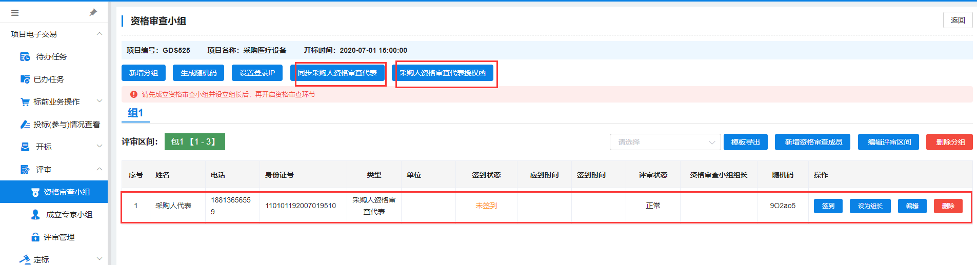通过点击【新增资格审查成员】进行添加多位资格审查成员,自动生成登录随机码。