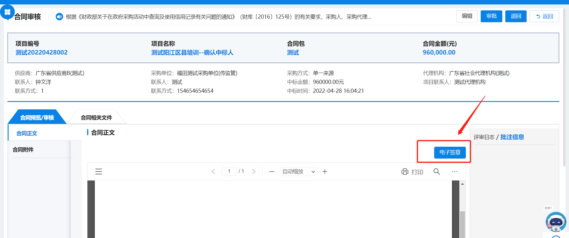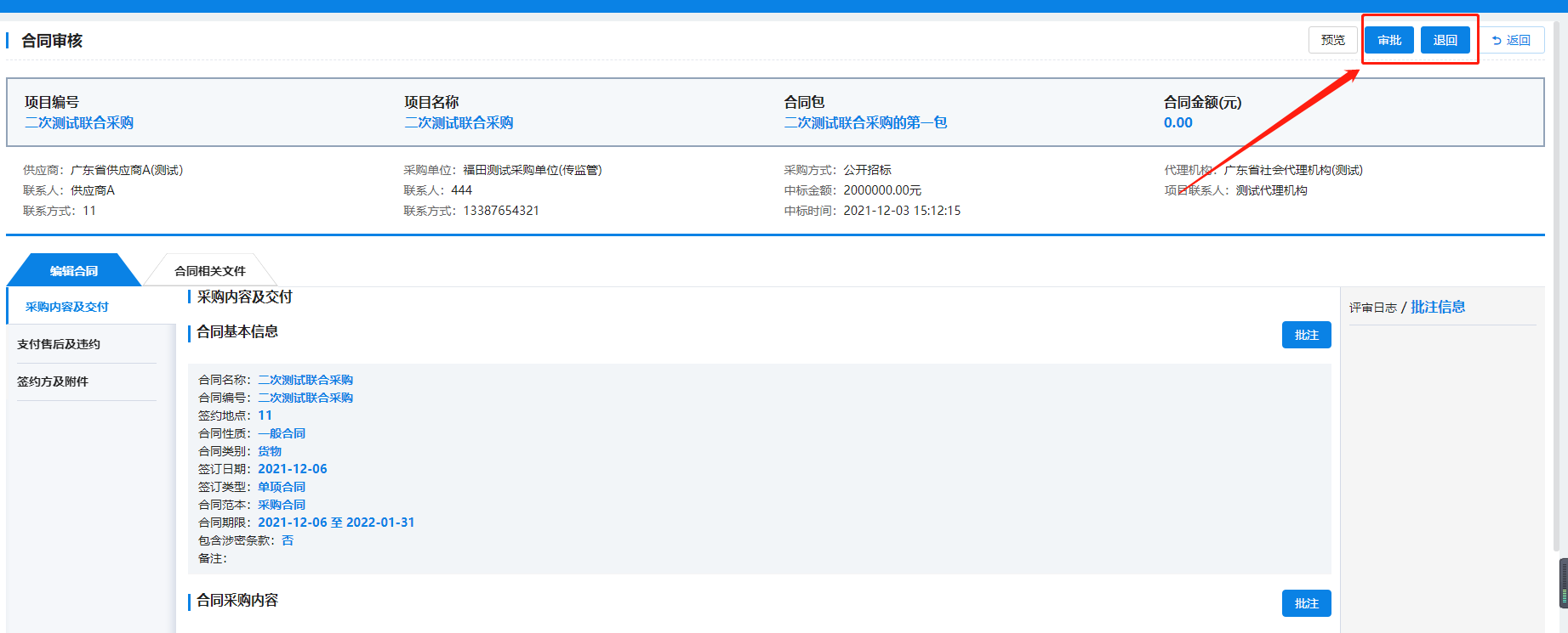 【退回】:退回到审核合同环节,有需要修改信息的需要先对细项进行批注再退回