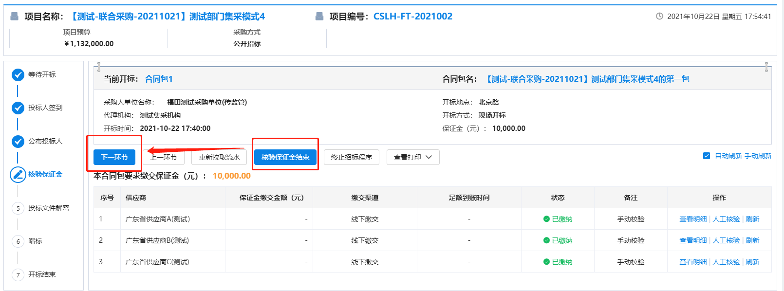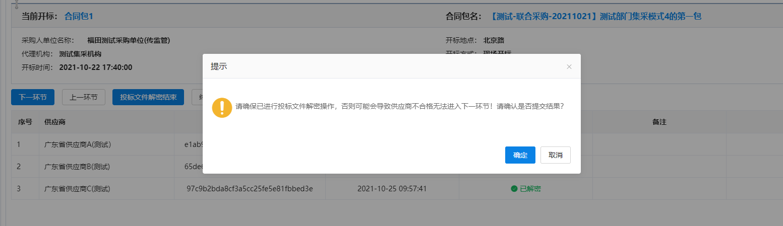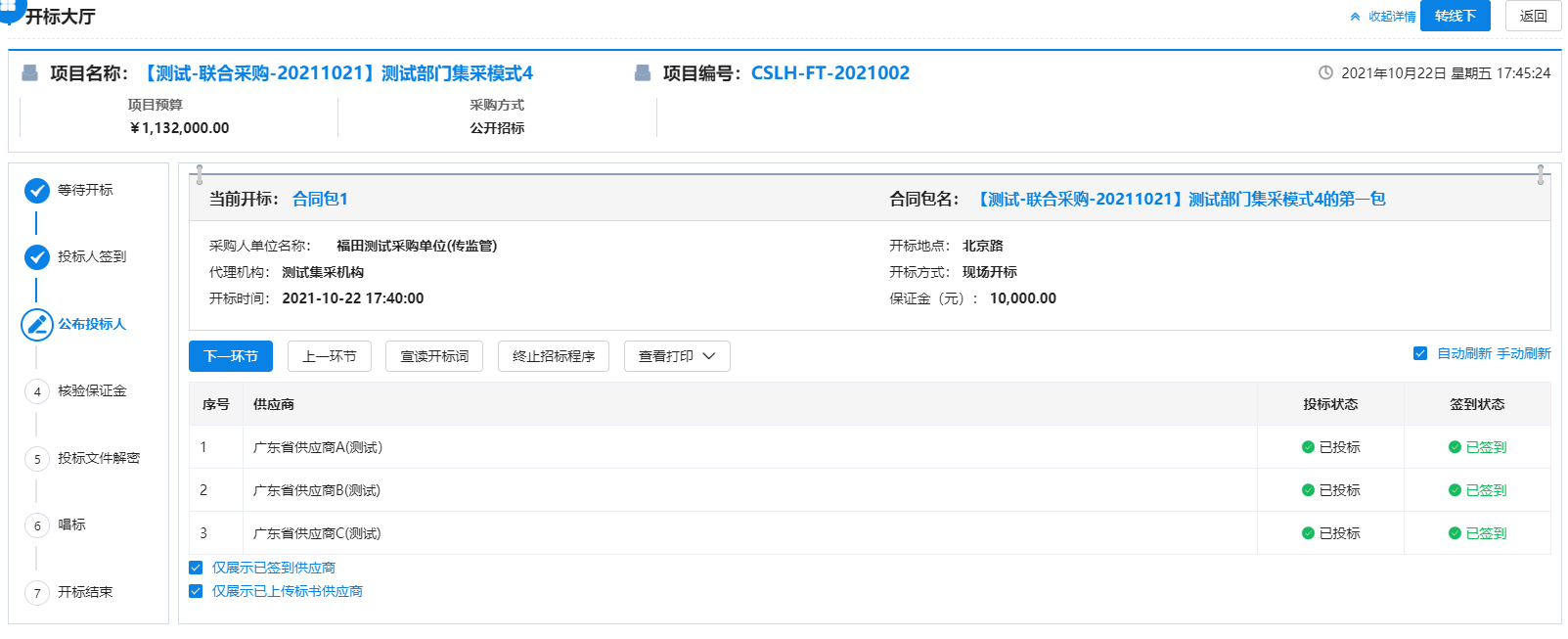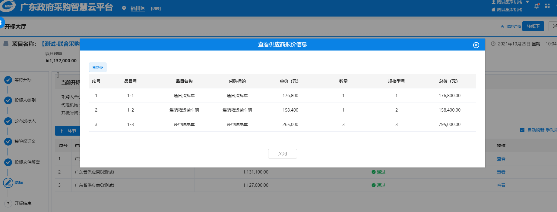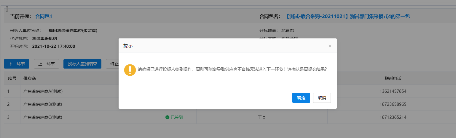 查看各供应商开标情况,确认无误后点击【退出】按钮,则表示开标完成,该过程根据实际情况打印开标过程表,如下图所示: