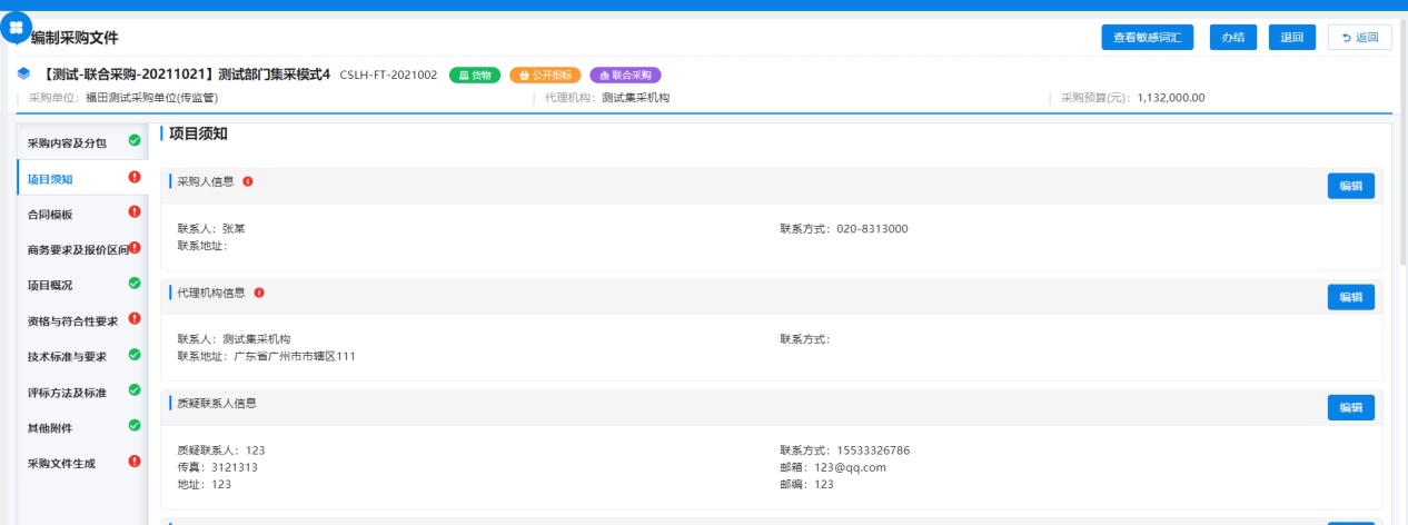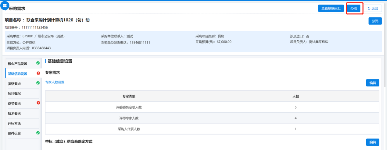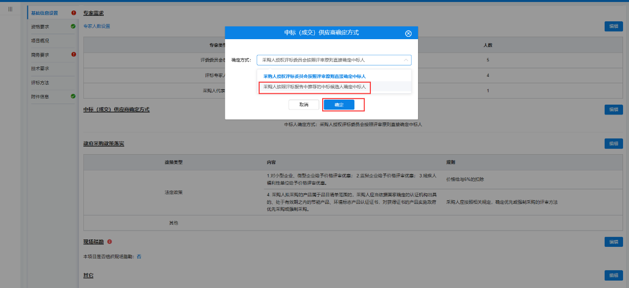**步骤二:**补充基础信息设置、资格要求、项目概况、技术/商务要求、评标方法等无“绿色√”标识模块中的内容。