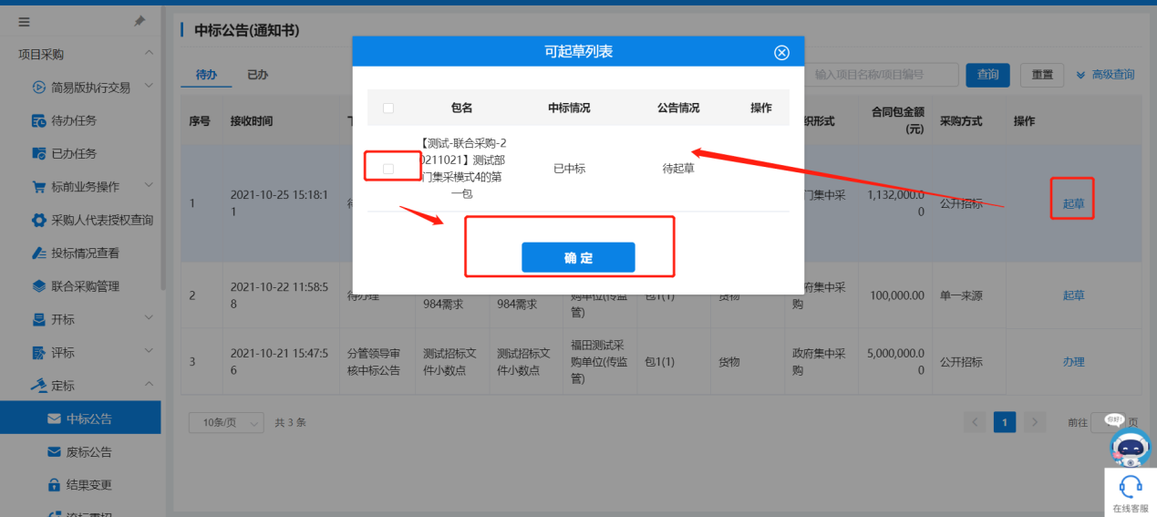 步骤一:请依次选择“项目365bet登录_365bet.com亚洲版_北海365信息分类→定标→中标公告”,找到待“起草/发布中标公告”的项目。点击【起草】,勾选合同包点击【确定】。