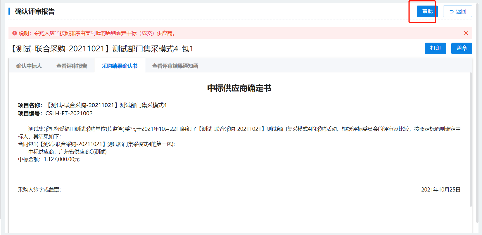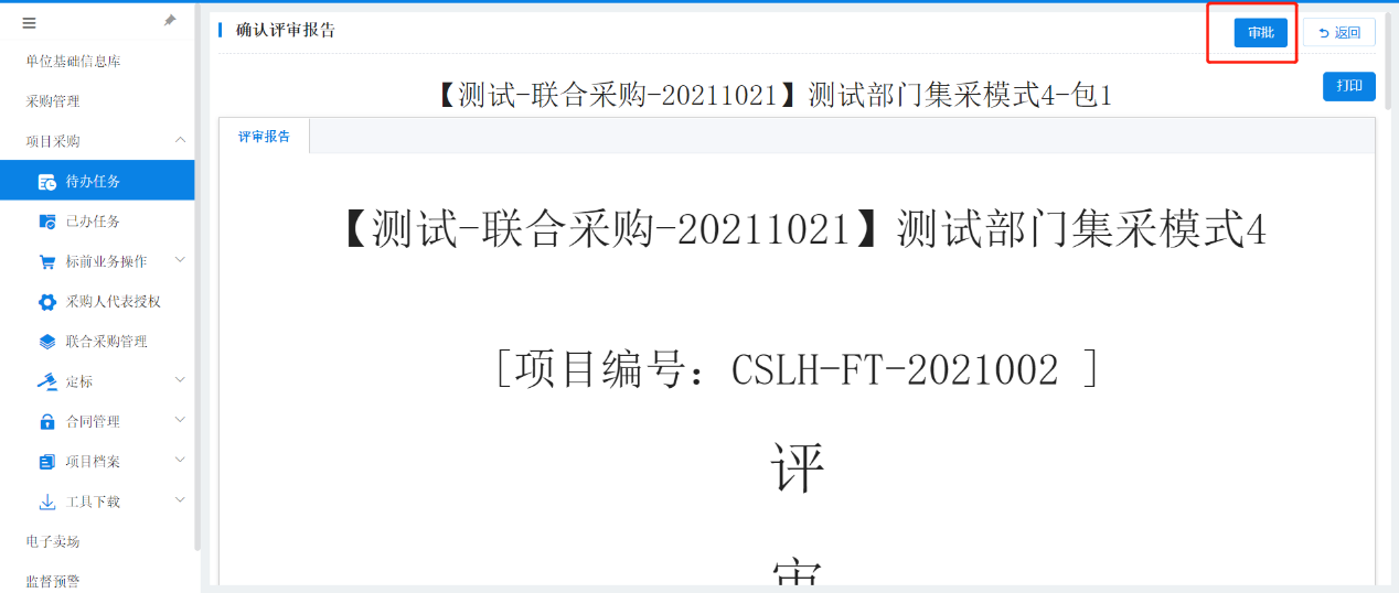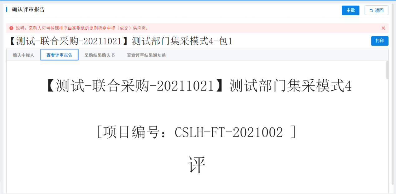 对《评审报告》进行打印,点击【审批】,填写备注(可不填),点击【确定】,进入草中标公告环节。