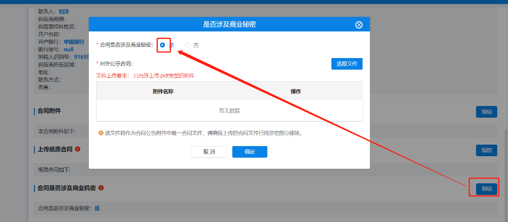 步骤三:填写365bet登录_365bet.com亚洲版_北海365信息分类内容及交付、支付售后及违约、签约方等合同信息,上传纸质合同(注:合同是否涉及商业机密,勾选“是”,需要上传对外公示的合同文件,该文件将作为合同公告附件中唯一合同文件,在门户进行公示,请确保上传的合同文件已将涉密部分移除。勾选“否”,则合同会对外公示,注意此选项的选择。)