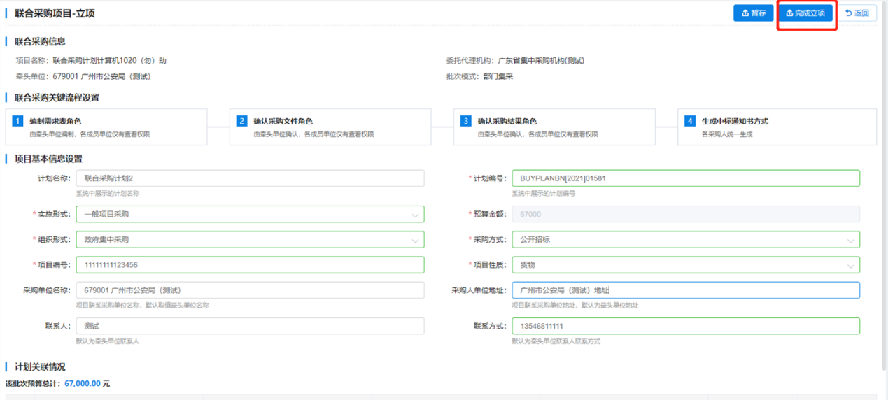 **步骤五:**确认信息无误,点击【完成立项】完成项目立项工作。