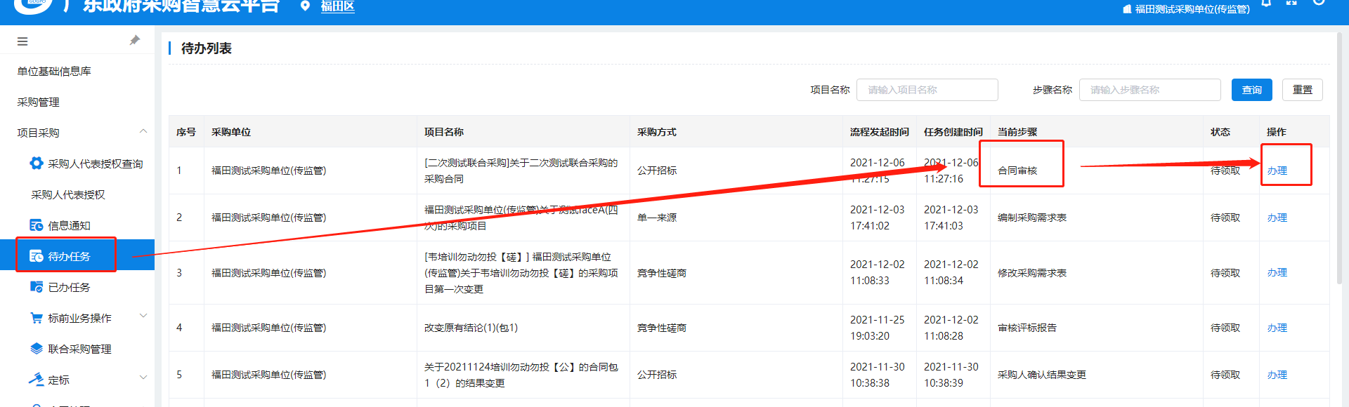 **步骤一:**请依次选择“项目365bet登录_365bet.com亚洲版_北海365信息分类→待办任务”,找到待“合同审核”的项目,点击【办理】。